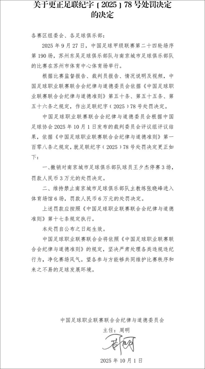 △单击上面的图片以查看10月1日的详细信息,中国足球联合会在其官方网站上决定了校正足球联合会联合会的决定。其中,决定恢复暂停南京市足球俱乐部球员王吉(Wang Xijie)三场比赛和30,000元人民币的罚款决定。 9月27日,在中国联赛一号的24日,苏州东武(Suzhou Dongwu)与南京市(Nanjing City)相匹配,王Xijie被染成红色,因为他被裁判员被认为是“击中对手的脸”。 9月30日,中国足球联合会暂停了他的另外三场比赛,并以30,000元的身份惩罚了他。主教练张小港因侮辱裁判而被停赛6场比赛,并惩罚了60,000元人民币。 Wang Xijie的个人资料照片指出,网民说:“这是正确纠正的。”“红牌不能取消,但可以取消暂停。通常是五个主要联赛,足球发展进展进展es。 ”资料来源:中国足球联合会的编辑Gao Xinyi由Lu Yi Wang Chenyu审查